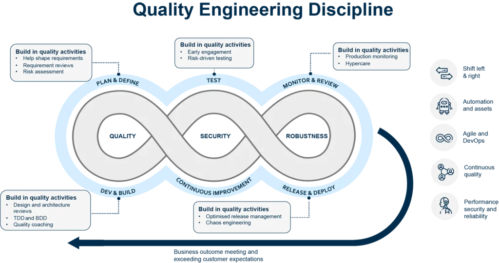 The discipline of QE wraps around all related activities, making it a holistic approach to quality where the focus is on the business outcome. Quality extends beyond testing and reaches from helping to shape requirements and risk assessments, through design and architecture reviews, and finally release management. Collaborative teams work iteratively with continuous feedback built into the process helps organisations achieve better quality at speed.