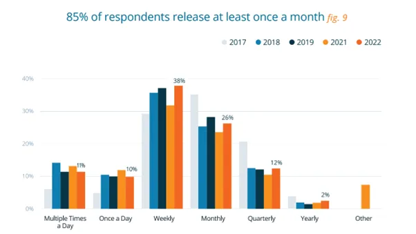 Whilst the demand from C-level Executives may be to deploy quicker, it is looking like the current trend is to slow down, as displayed in the graph below, where weekly, monthly, and quarterly releases have all increased.