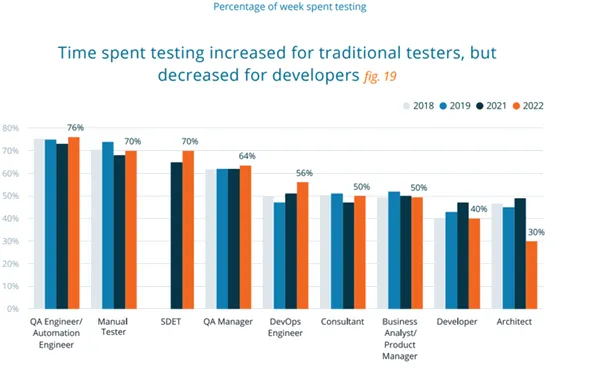 The most significant figures for me are those of the developer, namely the time they spend testing has decreased from 50% down to 40%. Given that everyone is talking about “shift left” strategies and how delivery can be accelerated, this does not seem to reflect this.
