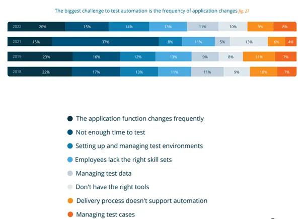 Finally, this last graph shows the biggest challenges to automation as reported by participants in the survey. Up since last year, from 15% to 20%, this biggest challenge is now the frequency of application changes.